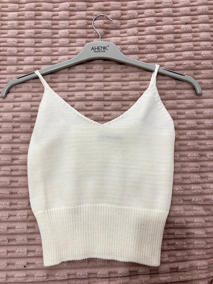 Beyaz V Yakalı Örgü Kısa Askılı Kadın Atlet