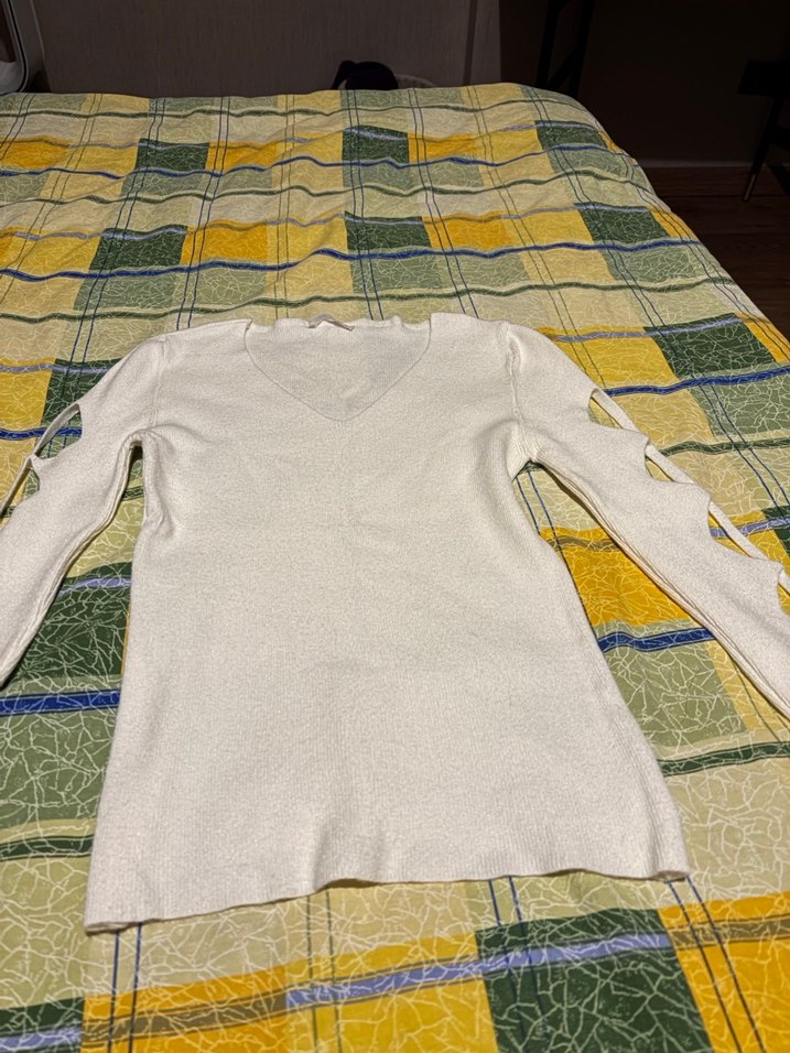 Yumuşak sentetik kumaştan, uzun kollu, V yakalı beyaz örgü kazak. Kollarda kesik detayları bulunur, rahat ve retro sokak stilini yansıtır. Günlük kullanım için uygundur.