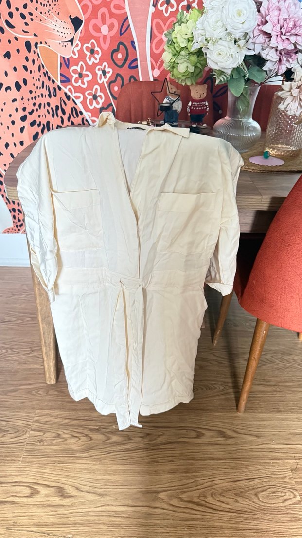 Rahat kesim, kısa kollu, V yakalı ve midi boyda beyaz renkte, desensiz tulum. Sayılı giyildi . Çok şık duruyor. Şortu kısa değil. Benim kalçam biraz geniş olduğu için giyerken zorlanıyorum
