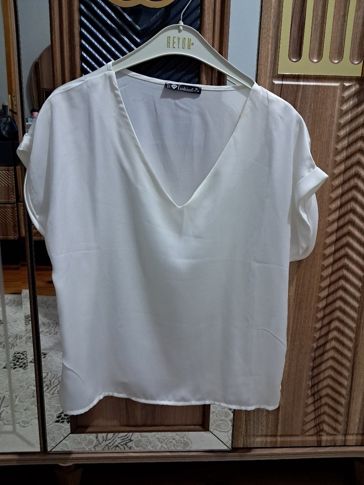 Beyaz, V yakalı ve kısa kollu saten kumaştan üretilmiş, salaş kesim ve normal midi boyda günlük minimalist tarzda bluz.