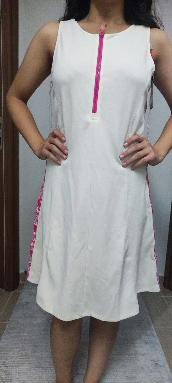 V yakalı, kolsuz ve fermuarlı beyaz midi elbise. Rahat kesimi ve sentetik dokusu ile günlük spor tarzına uygundur. Sadece uygulamaya fotoğraf çekimi için giyilmiştir