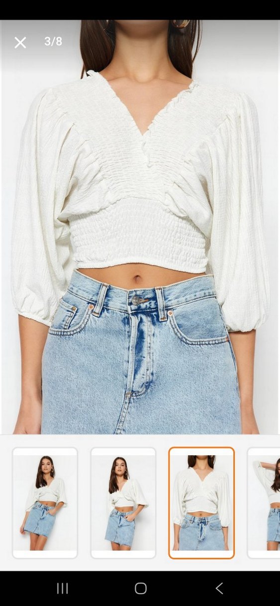 Beyaz renkte, V yakalı, uzun kollu ve düğmeli denim bluz. Salaş kesimi ve midi boyuyla günlük kullanıma uygundur. Hiç giymedim