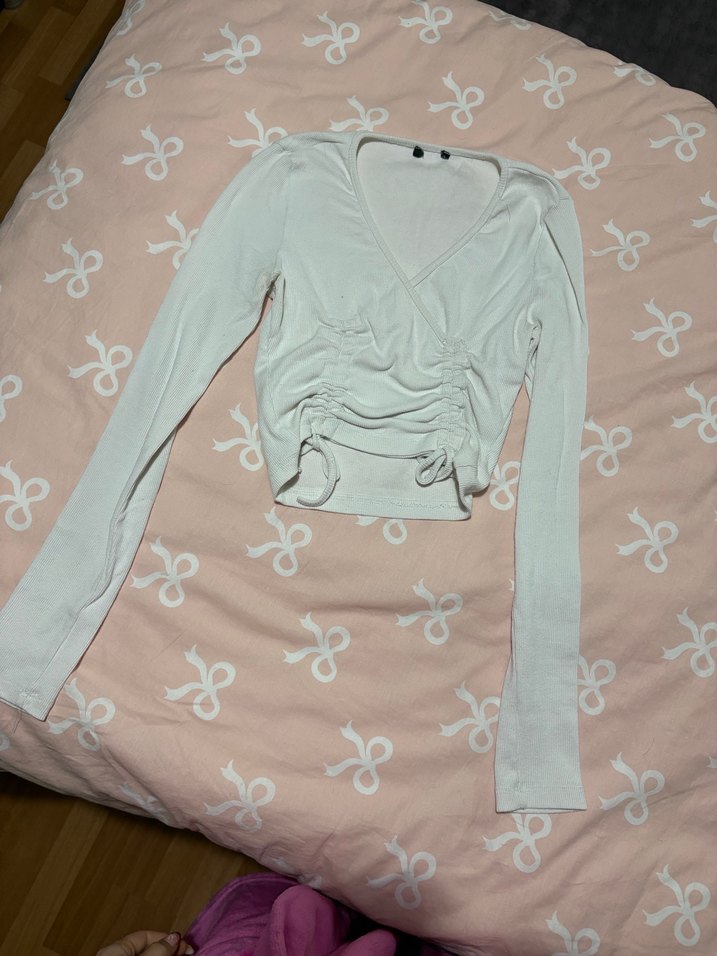 Beyaz, v yakalı ve uzun kollu, ön kısmı büzgülü, yumuşak kumaştan günlük kullanıma uygun dar kesim kadın bluz.