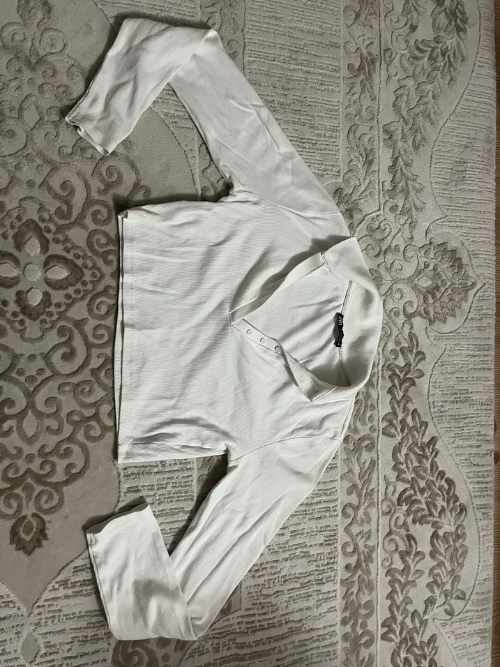Pamuk kumaştan yapılmış, v yaka ve uzun kollu beyaz, dar kesim kadın bluz. Günlük kullanım için rahat ve şık bir sokak tarzı sunar.