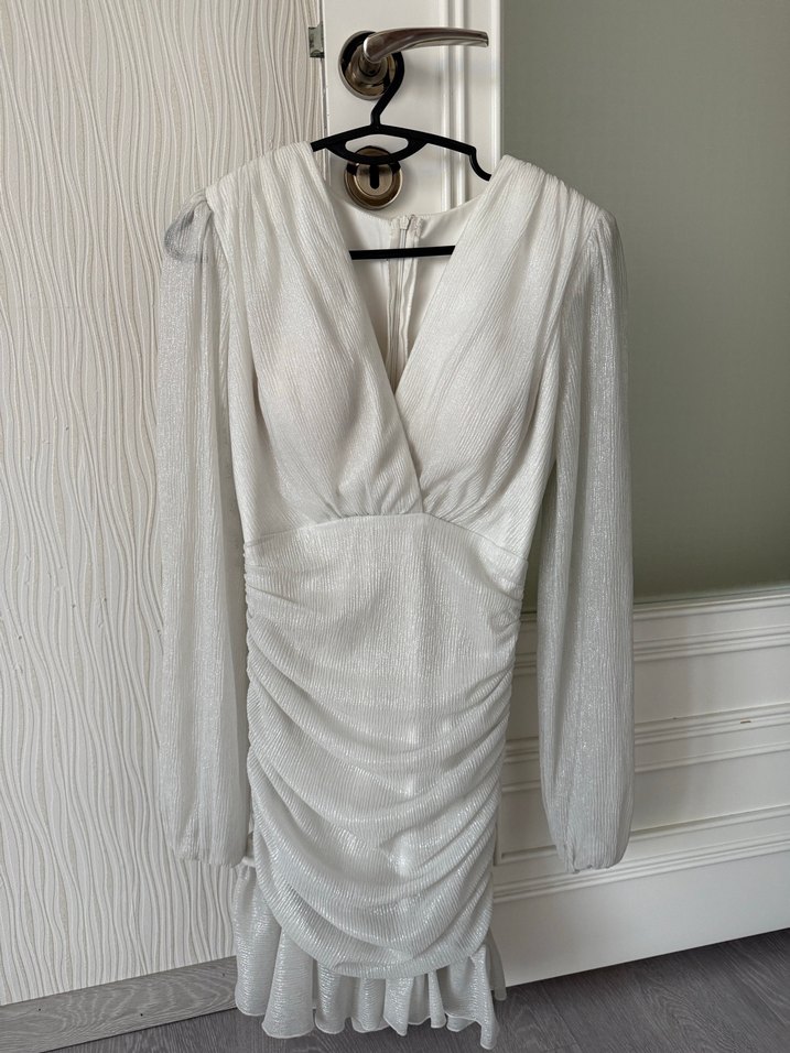 V yakalı, uzun kollu ve drapeli detaylara sahip beyaz midi elbise, klasik zarafeti modern Paris tarzıyla buluşturuyor. Düğün ve özel günler için uygun. SADECE BİR KERE GİYDİM ÜSTTE MÜKEMMEL DURUYOR ALACAK OLANA HAYIRLI OLSUN .Simli kumaştır İNDİİRM YAPABİLİRİM