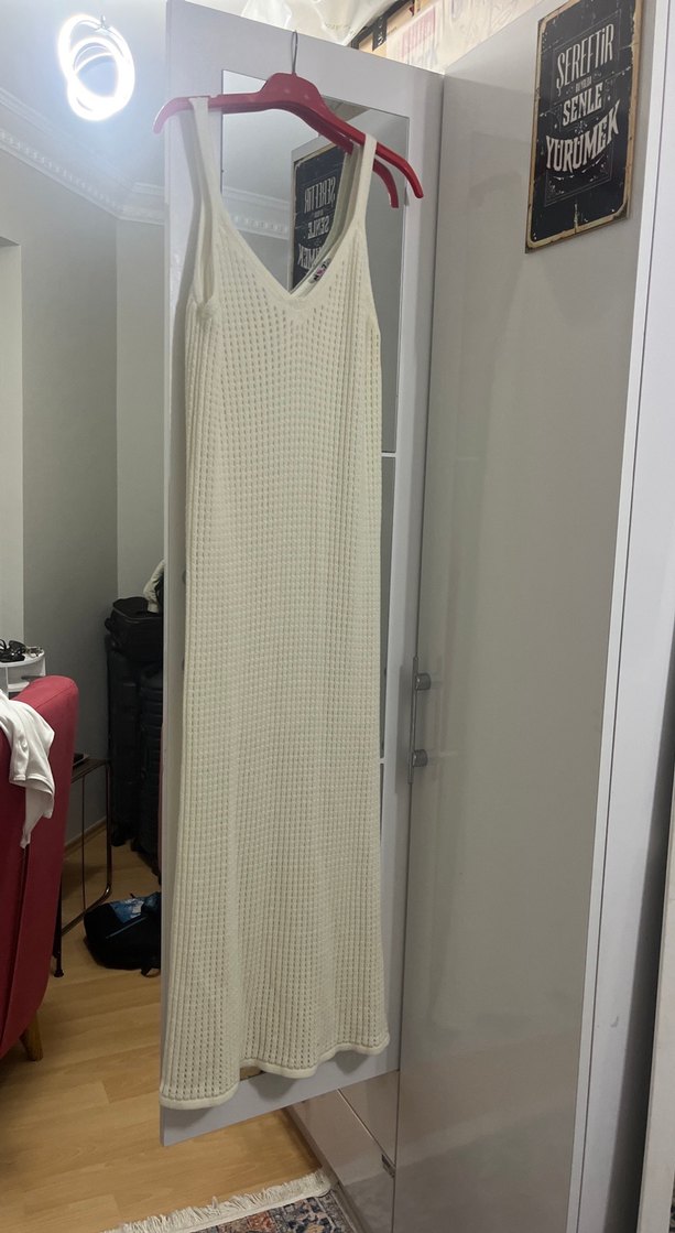 Beyaz, V yakalı, kolsuz, uzun triko elbise, yumuşak sentetik kumaştan, bol kesimle günlük kullanıma uygundur.