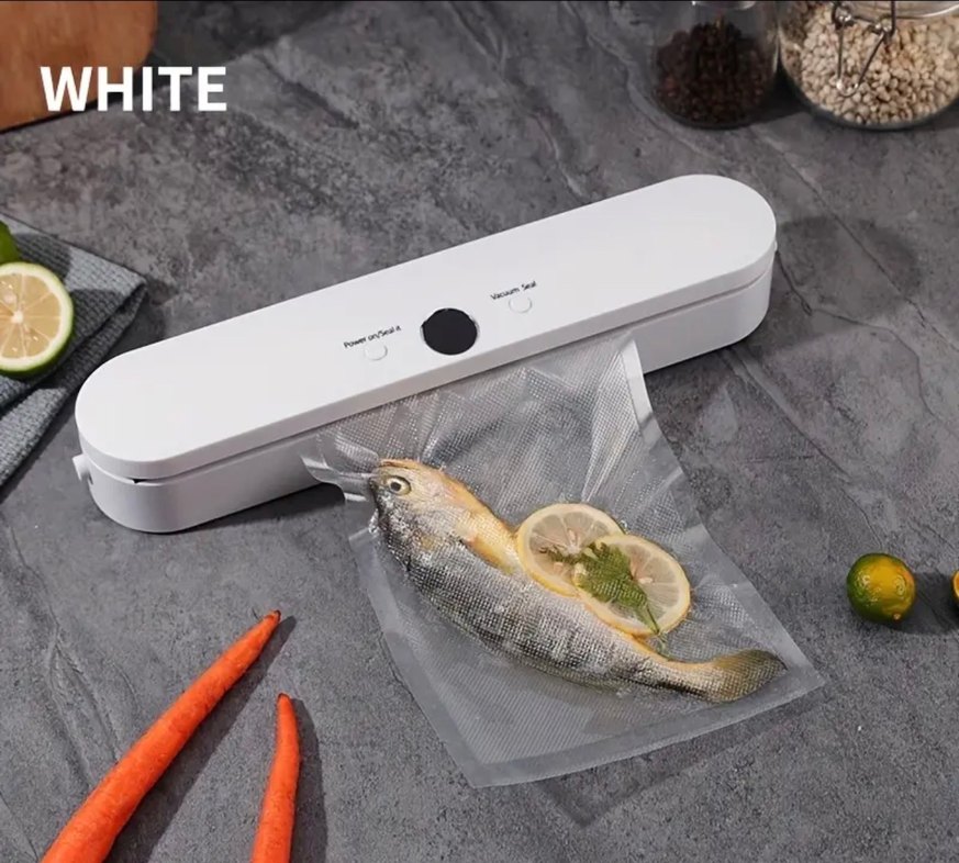 Beyaz ve gri renklerdeki bu vakumlu paketleme makinesi, balık gibi yiyecekleri şeffaf torbada vakumlayarak saklamaya yarar. Üzerinde güç ve mühürleme düğmeleri bulunur.
