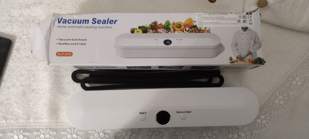 Beyaz renkli, gıdaları daha uzun süre taze tutmak için vakumlu ve normal mühürleme seçenekleri sunan gıda saklama makinesi.