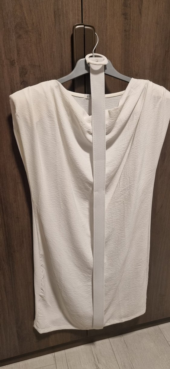 Beyaz renk,kolları vatkalı,diz üstü,kemerli,hiç giyilmemiş elbise ya da tercihen tunik olarak kullanıma uygun elbise.