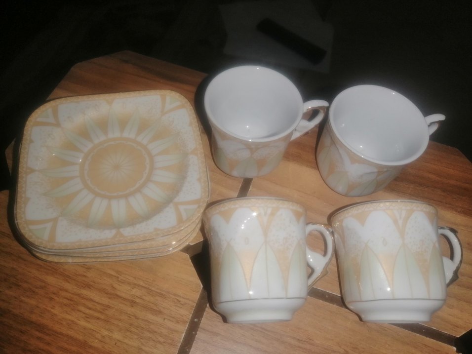 Beyaz fincanlar açık bej desenlerle süslenmiş ve kare desenli tabaklarla uyumlu. 4 adet fincan ve tabak takımı.