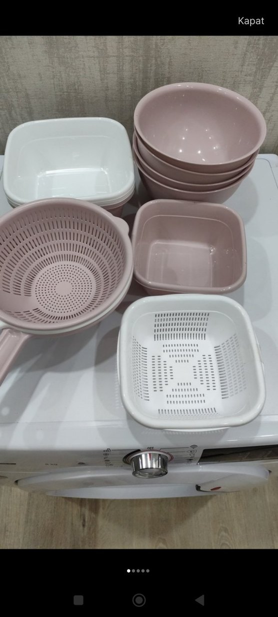 Beyaz ve açık renklerde çeşitli boylarda plastik kaseler ve süzgeçler içeren mutfak gereçleri seti. ️ 7 adet