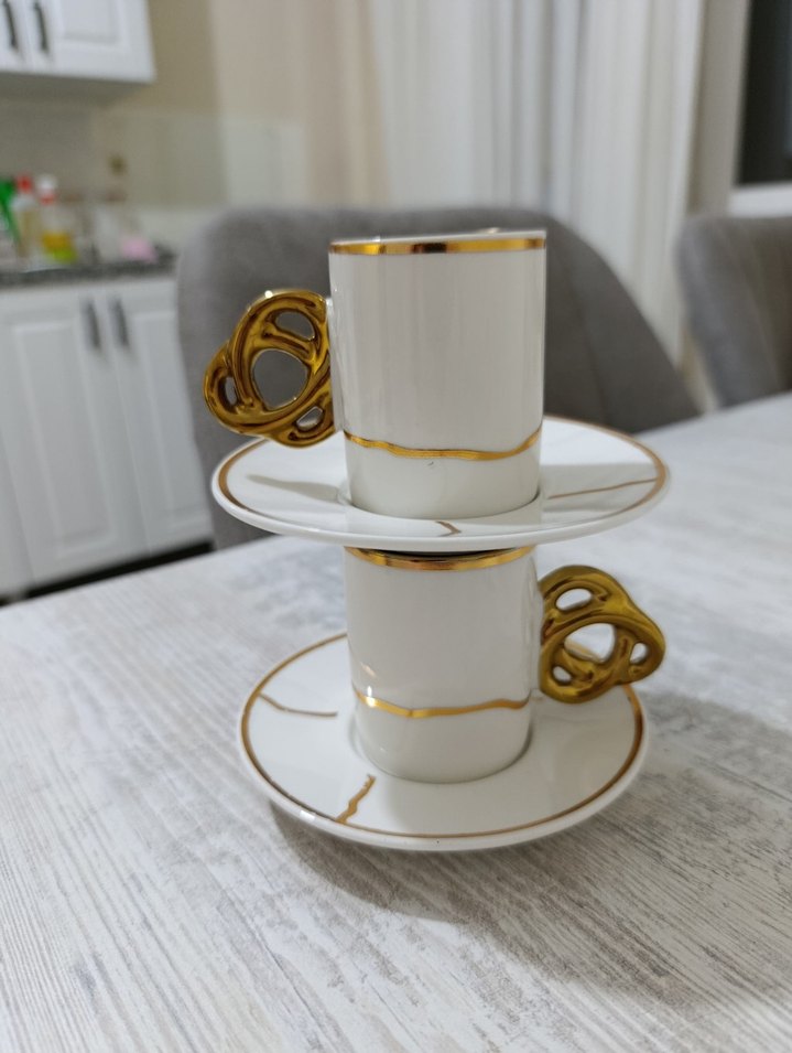 Beyaz fincan seti, parlak altın detaylı kulplar ve kenarlarla birlikte, uyumlu tabağıyla şık bir görünüm sunar. ☕ deformeler var dikkatli bakın lutfen