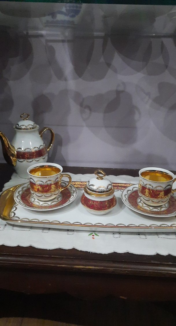Cok eski donem incecik porselen Altın ve kırmızı detaylı beyaz kahve fincanı seti; iki fincan, demlik, şekerlik ve tepsi içerir. ☕