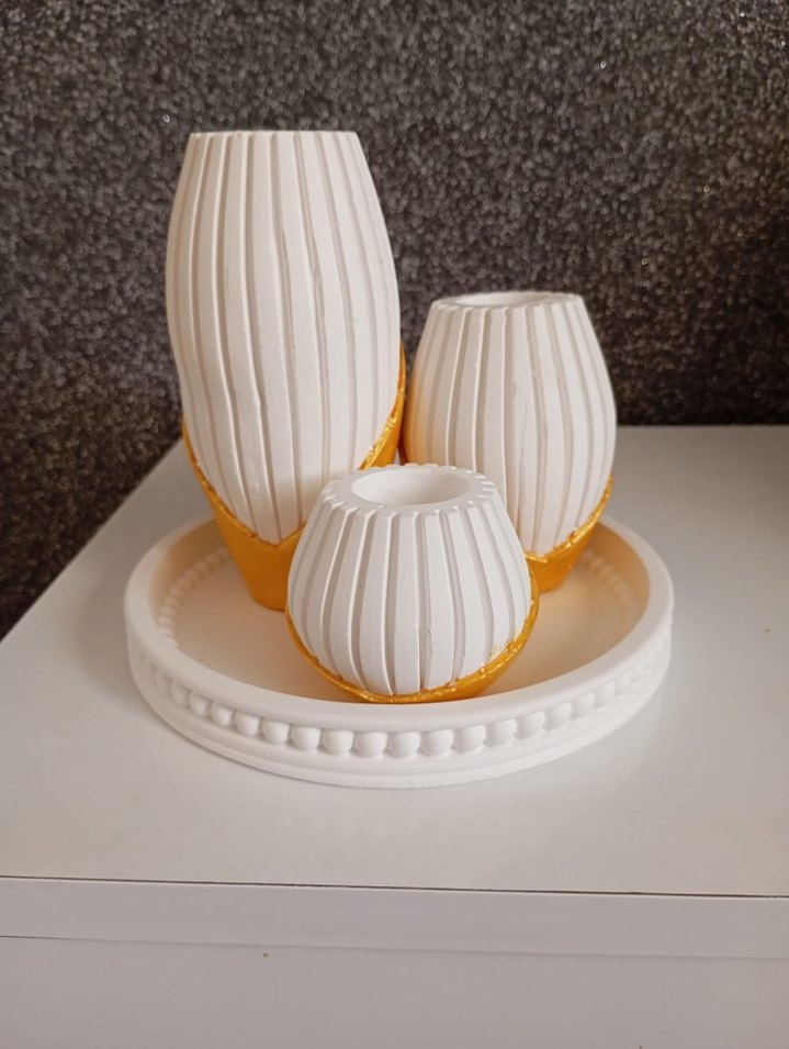 Dikey çizgili beyaz ve altın detaylı üç mumluk, dekoratif kenarlı yuvarlak beyaz tepsi üzerinde yer alıyor. ️