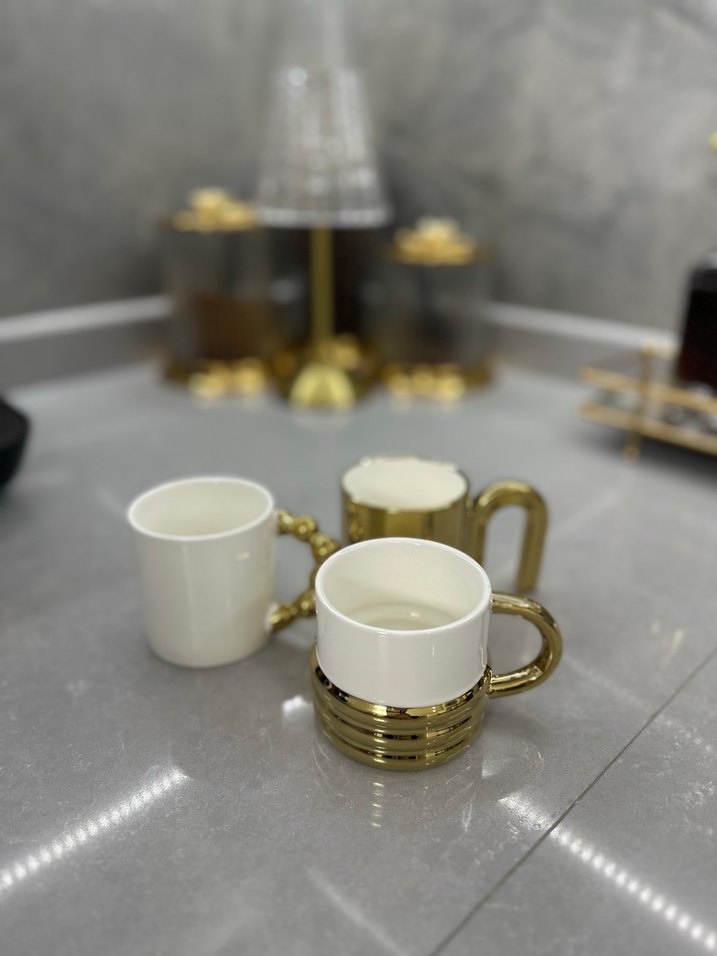 Beyaz seramikten yapılmış, altın detaylı kulpları ve şık tasarımıyla dikkat çeken fincan seti. ☕