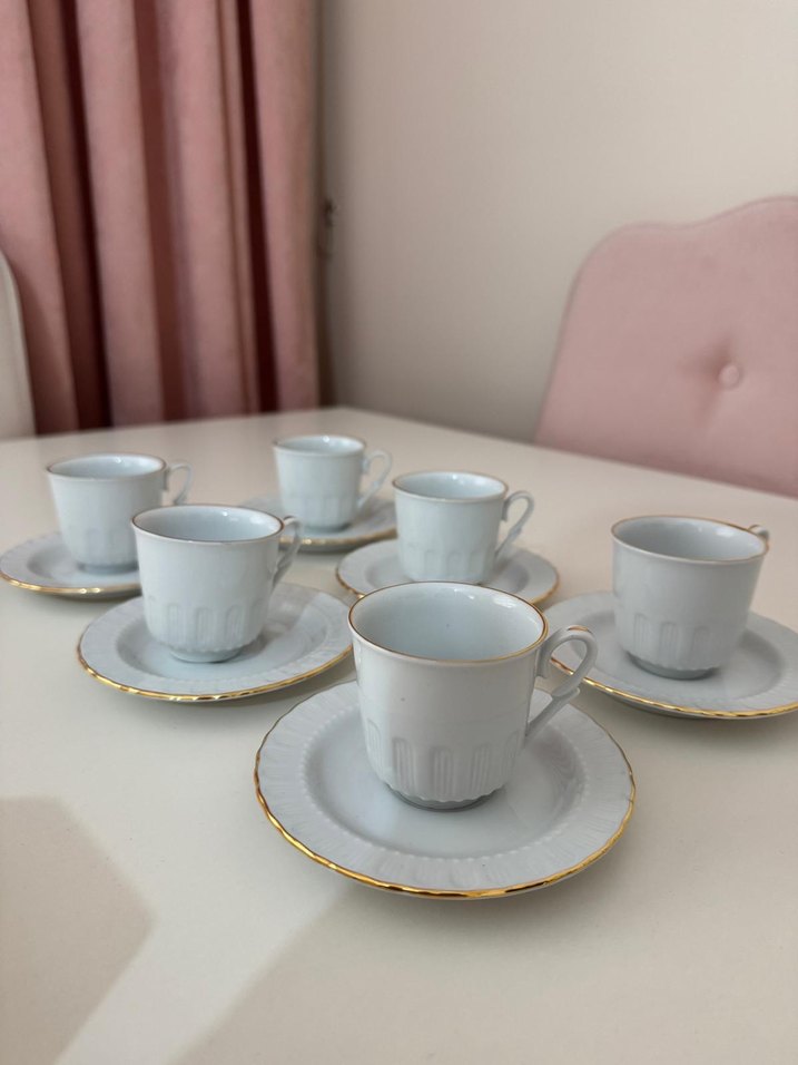 Altın kenarlara sahip beyaz 12 lı kahve fincanı ve tabak seti, espresso veya Türk kahvesi için uygundur. ☕