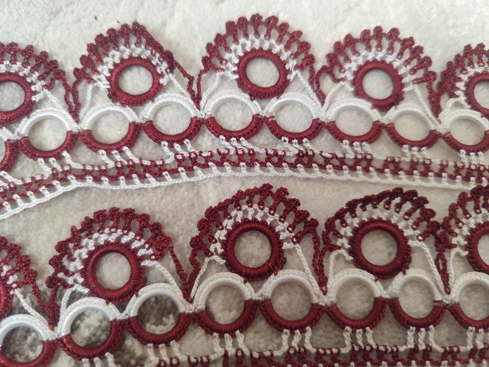 Beyaz ve bordo renklerde, dairesel ve detaylı desenlere sahip el yapımı dantel kenar. ✂️