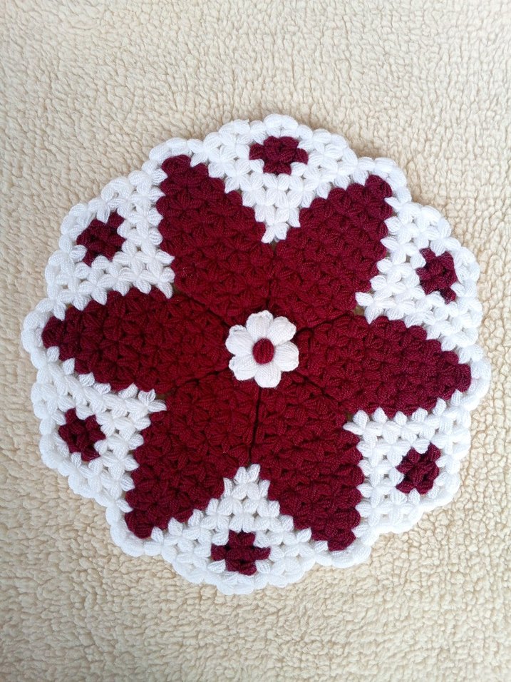 Beyaz ve bordo renklerle örülmüş, ortasında çiçek deseni bulunan yuvarlak çeyizlik lif. El işidir, pazarlık yapabiliriz. Yeni modeldir.