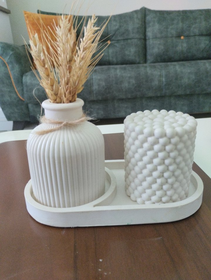 Beyaz tepsi üzerinde, kabarcık desenli beyaz mum ve kuru buğdaylı dekoratif vazo seti bulunuyor. ️