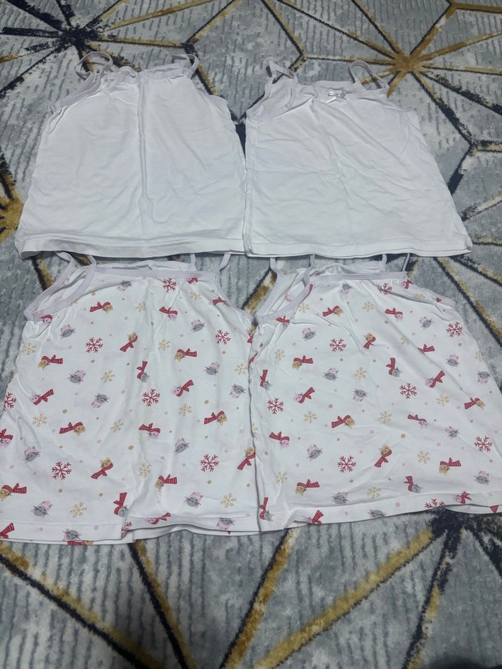 Dört adet kız çocuk atleti, ikisi düz beyaz, ikisi kırmızı ve altın renkli fiyonk ve kar tanesi desenli, yumuşak kumaştan üretilmiştir.