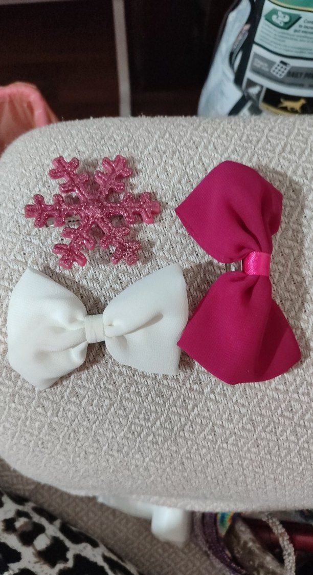 Beyaz ve fuşya renklerde fiyonk saç tokaları ile pembe nakışlı kar tanesi tokası seti.