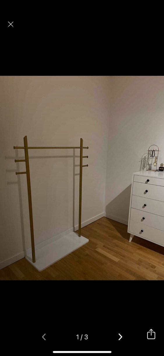 Çoklu askı çubuklarına sahip beyaz ve gold ayakta duran askılık. Dayanıklı tabanlı ve sade tasarımlı.
