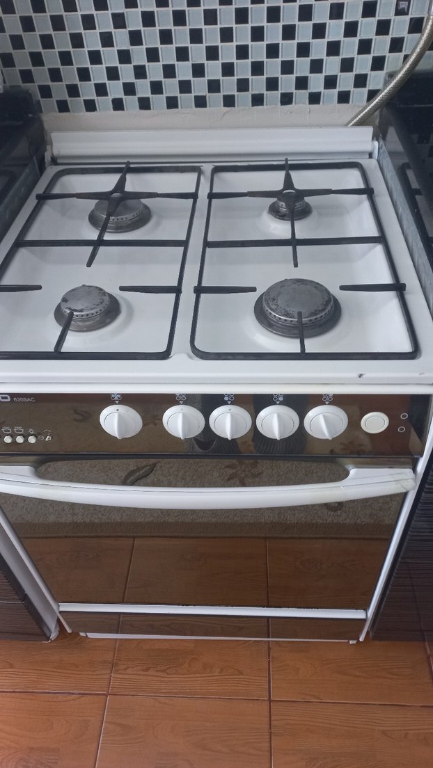 Kontrol düğmeli, altında fırın bulunan beyaz ve gri 4 gözlü gazlı ocak. Mutfakta yemek pişirmek için kullanılır.
