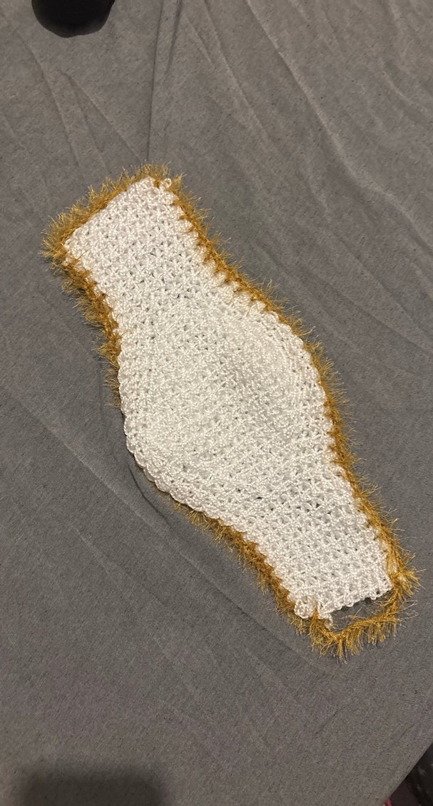 Beyaz örme dokusu ve gri arka plan üzerine altın rengi kenarları olan banyo süngeri, cildi nazikçe temizler ve ölü deriyi atmaya yardımcı olur.