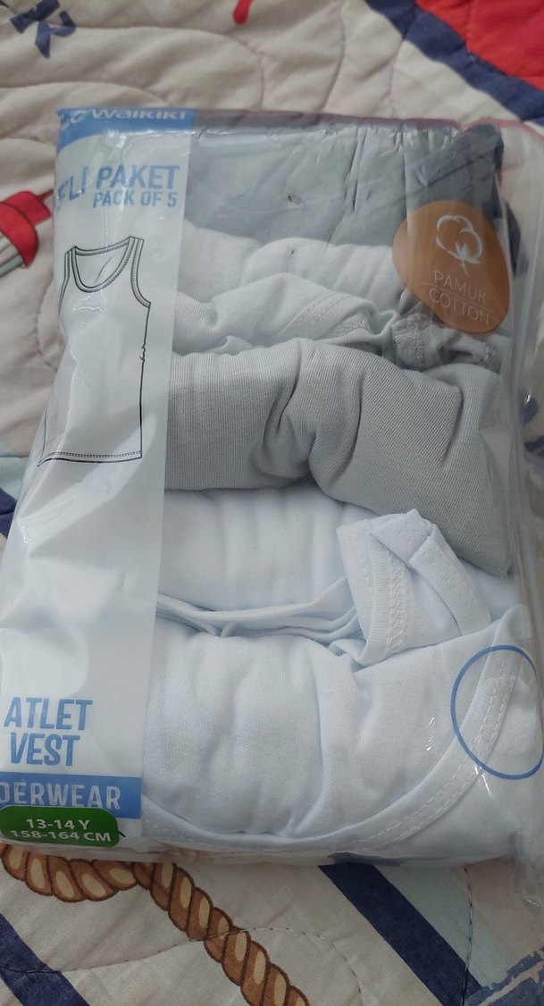 13-14 yaş çocuklar için beyaz ve gri renklerde baskılı 5 adet pamuklu atlet paketi. Rahat ve nefes alabilir kumaş içerir.