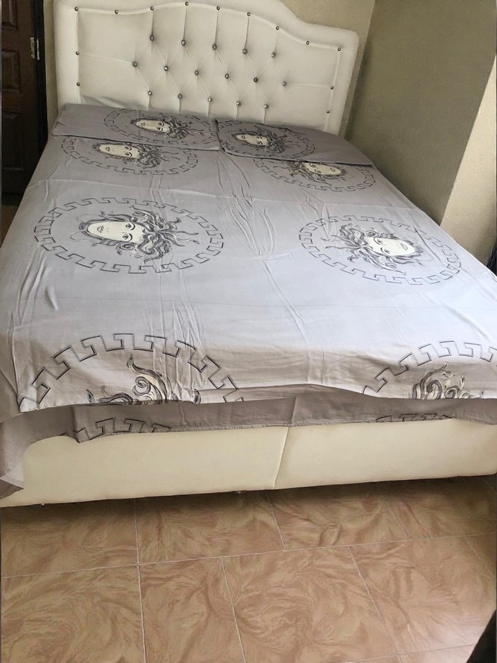 Gri zemin üzerinde beyaz ve gri baskılı, sanatsal yüz desenleri bulunan yumuşak dokulu nevresim. ️ Pamuk-Saten 2 adet yastık kılıfı ölçü: 55x75cm Çarşaf Ölçü: 215x225cm Nevresim Ölçü: 210x178cm Sayılı kullanıldı.Yeni gibi.