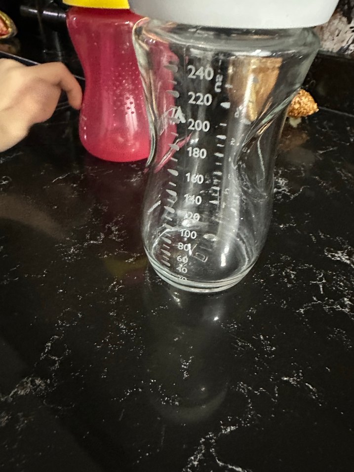 Beyaz ve gri renkli, 240 ml kapasiteye sahip bebek biberonu. 180 ve 220 ml işaretleri okunabilir. Ergonomik tasarımlı.