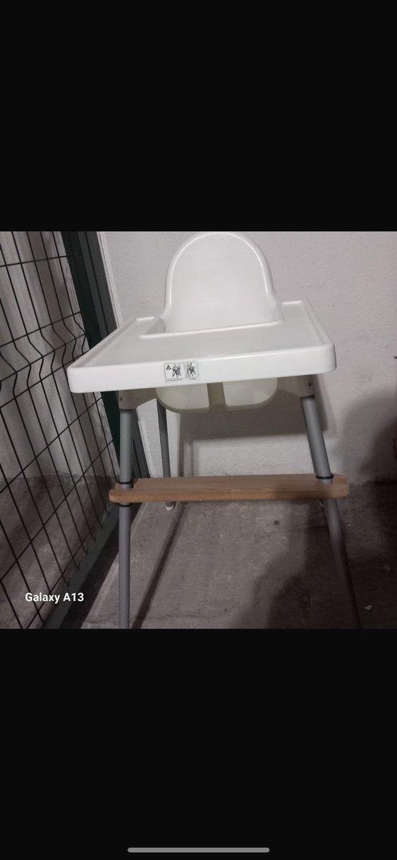 Beyaz ve gri renkte, sağlam yapıya sahip, ahşap ayak dayama ve geniş tepsili bebek mama sandalyesi.