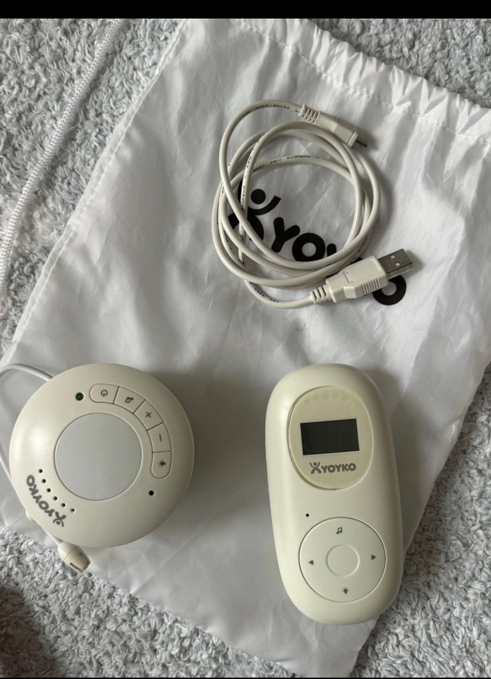 Sesli iletişim ve uzaktan kumanda düğmelerine sahip beyaz ve gri bebek monitörü seti, USB şarj kablosu ile birlikte. Üzerinde XYOYKO markası bulunur.