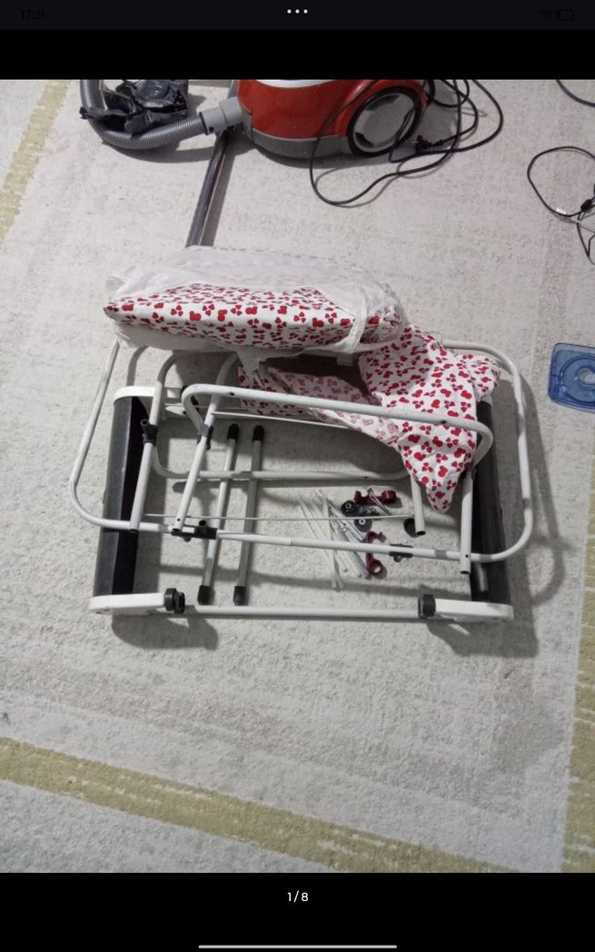 Beyaz metal çerçeveli, gri ve desenli kumaş yastıklı katlanabilir bebek sepeti ve beşiği. Montaj için küçük aksesuarlar içerir.