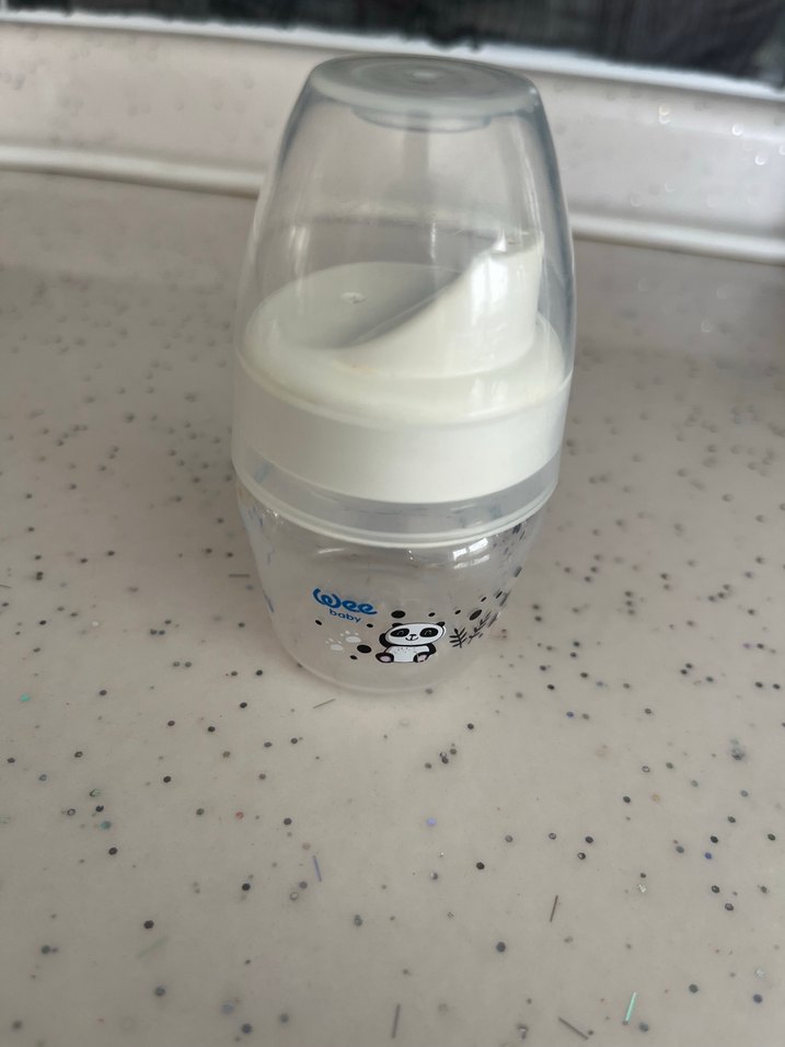 Şeffaf kapaklı, beyaz ve gri renklerde, panda desenli bebek suluğu.