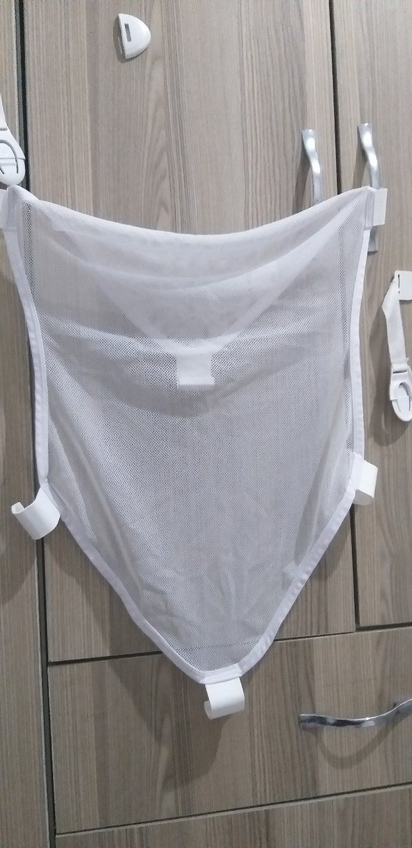 Nefes alabilen file kumaştan yapılmış beyaz ve gri bebek taşıma askısı. Ayarlanabilir kayışlar sayesinde güvenli kullanım sağlar.