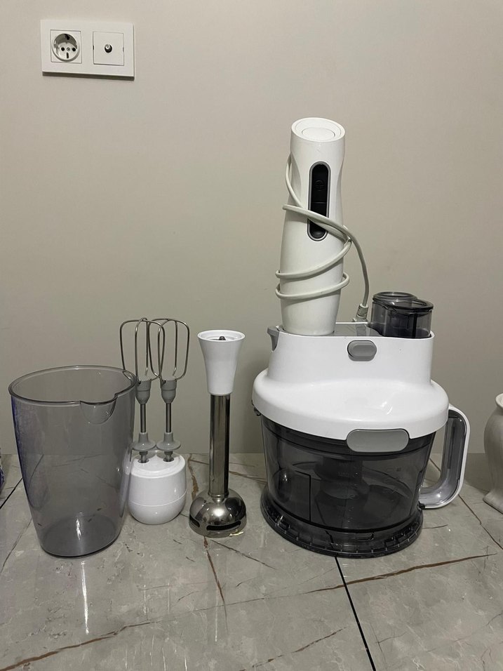 Beyaz ve gri renklerde, çeşitli aparatlarıyla çok amaçlı kullanıma uygun blender seti. plastik haznesi yoktur.