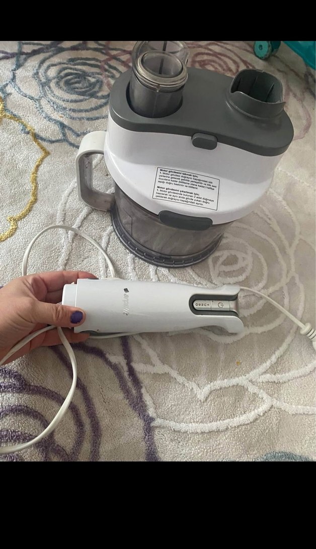 Ergonomik saplı, kolay temizlenebilir beyaz ve gri blender ve doğrayıcı. Kompakt tasarımlı ve basit kontrollere sahip.