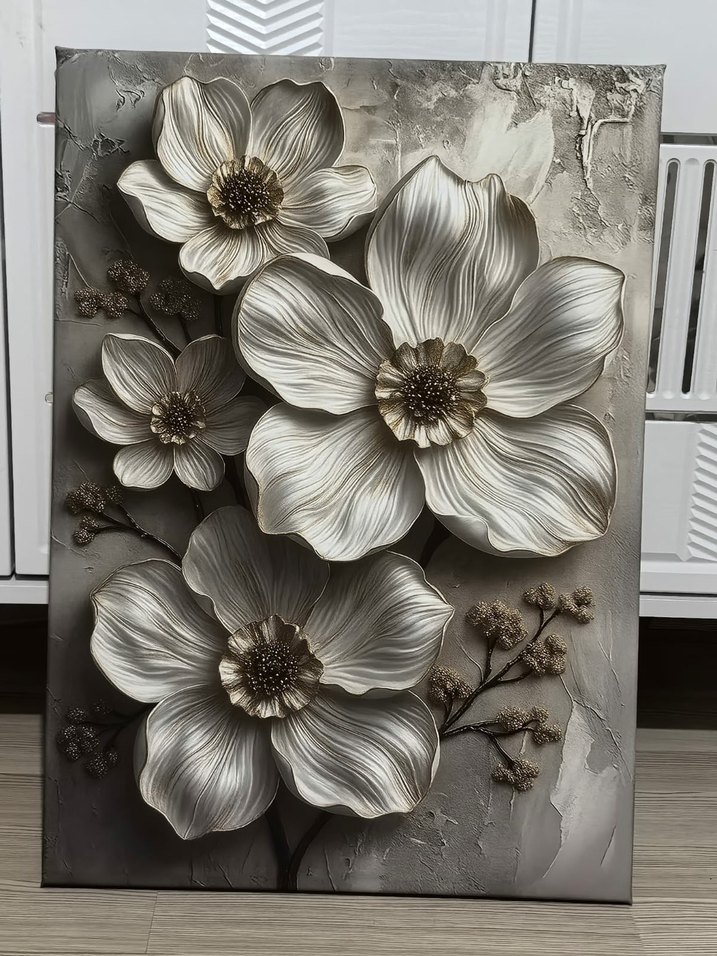 Kabartmalı beyaz çiçeklerin detaylı yaprakları gri dokulu zemin üzerinde üç boyutlu bir görünüm sunar. kanvas tablo dijital baskı 50x70 cm