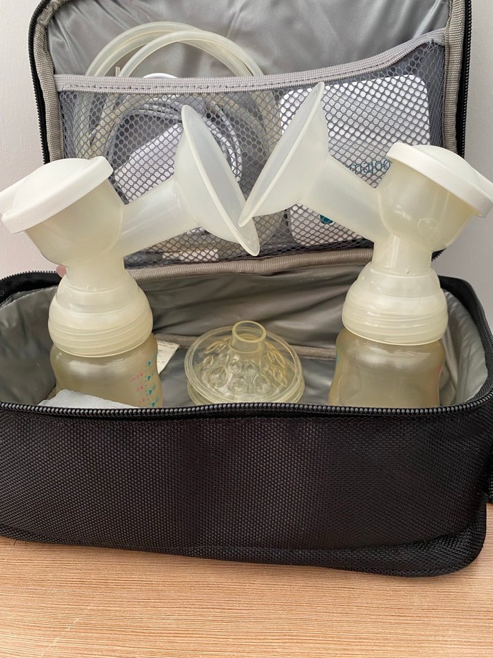 Beyaz ve gri renklerde çift göğüs pompası, iki şişe ve hortum ile birlikte siyah taşıma çantasında saklanmıştır.