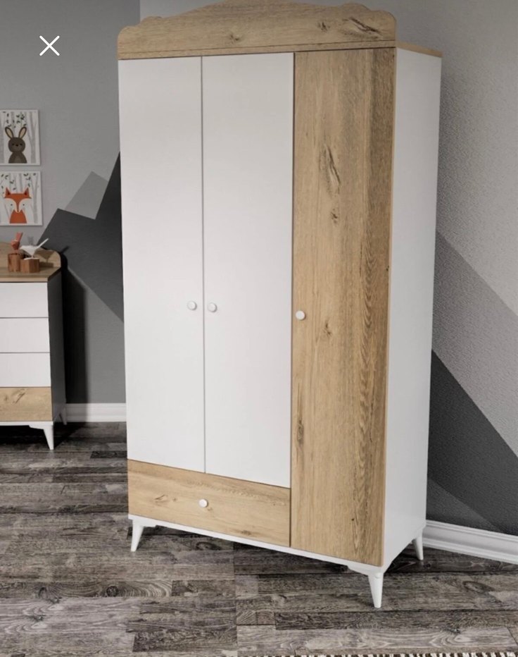 Çok kapaklı ve çekmeceli, beyaz ve gri renkli, ahşap dokulu çocuk gardırobu. Modern görünüm için açılı ayaklara sahiptir. (Teslimat için ek ücret karşılığı gönderilebilir )