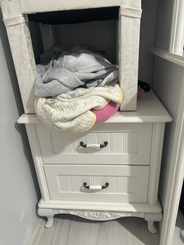İki çekmeceli beyaz çocuk komodu, dekoratif kulplara sahip. Üstünde gri kumaş saklama kutusu bulunur. Klasik oyma detaylar ve kıvrımlı ayaklar vardır.
