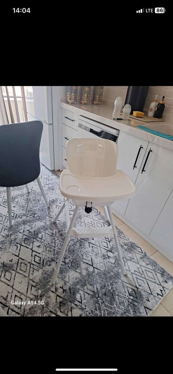 Beyaz ve gri renkte, sağlam yapılı çocuk mama sandalyesi, yemek tepsisi ile birlikte.