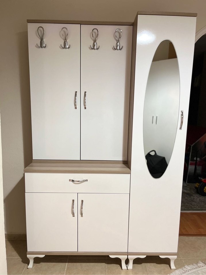 Beyaz ve gri renkli dolap organizer, çoklu bölmeler, askılar ve tam boy oval ayna içerir. Altında çekmece ve dolaplarla kullanışlı depolama sağlar. Nerdeyse hiç kullanmadım. Herhangi bi deformesi yoktur. Ölçüleri 120/195