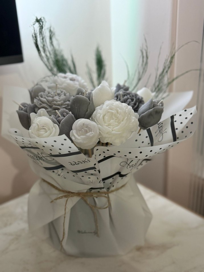 Beyaz ve gri çiçek desenleriyle süslenmiş, desenli kağıt ve ip ile bağlanmış dekoratif vazo. Her ortama zarif bir dokunuş katıyor. Mumdan yapılmış el emeği