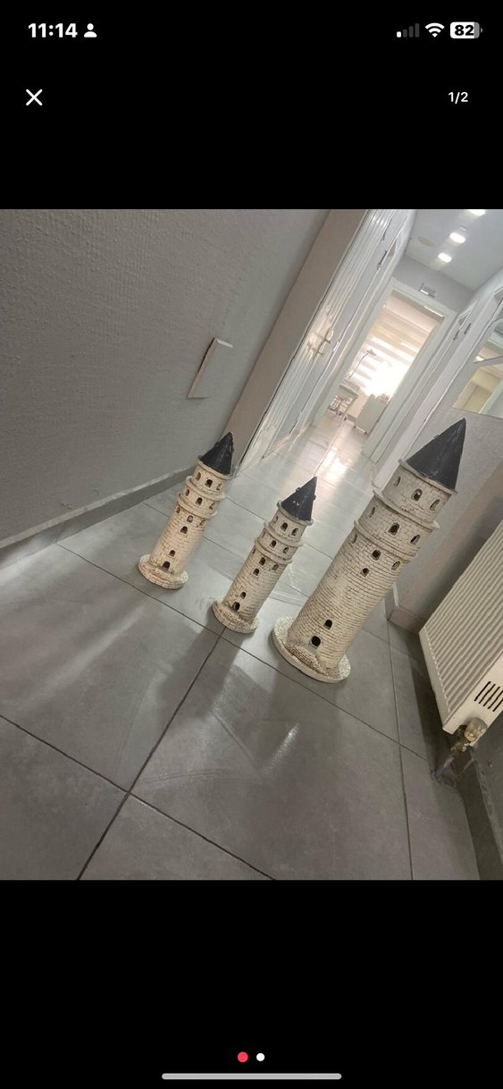 Beyaz ve gri renklerde, farklı boylarda üç deniz feneri biblosu seti. Dokulu yüzeylere ve sivri üstlere sahiptir.