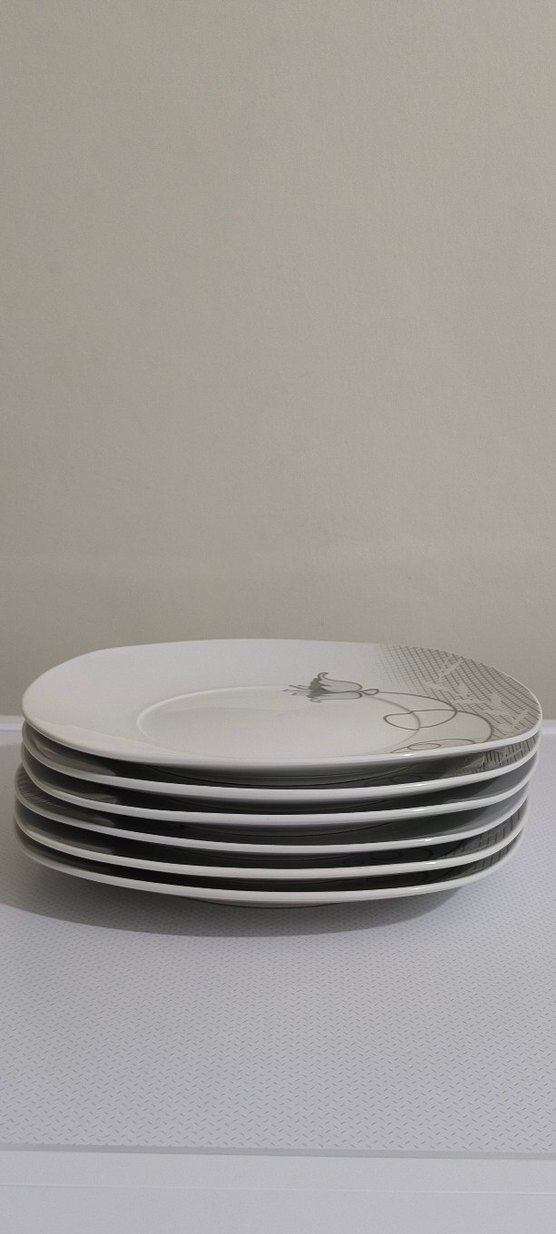 Gri desenli beyaz tabaklardan oluşan 6 li set, yemek servisi için uygundur. ️