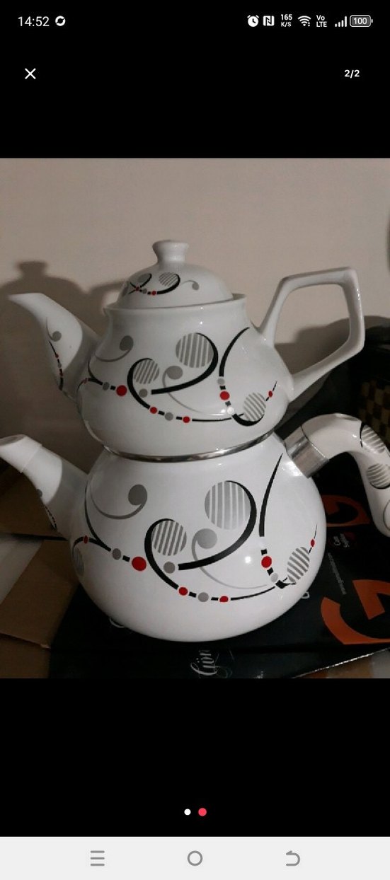 Beyaz renkte, gri ve kırmızı desenlere sahip çaydanlık seti. İki parçalı, üst üste konan tasarımıyla çay demlemek ve servis yapmak için uygundur.
