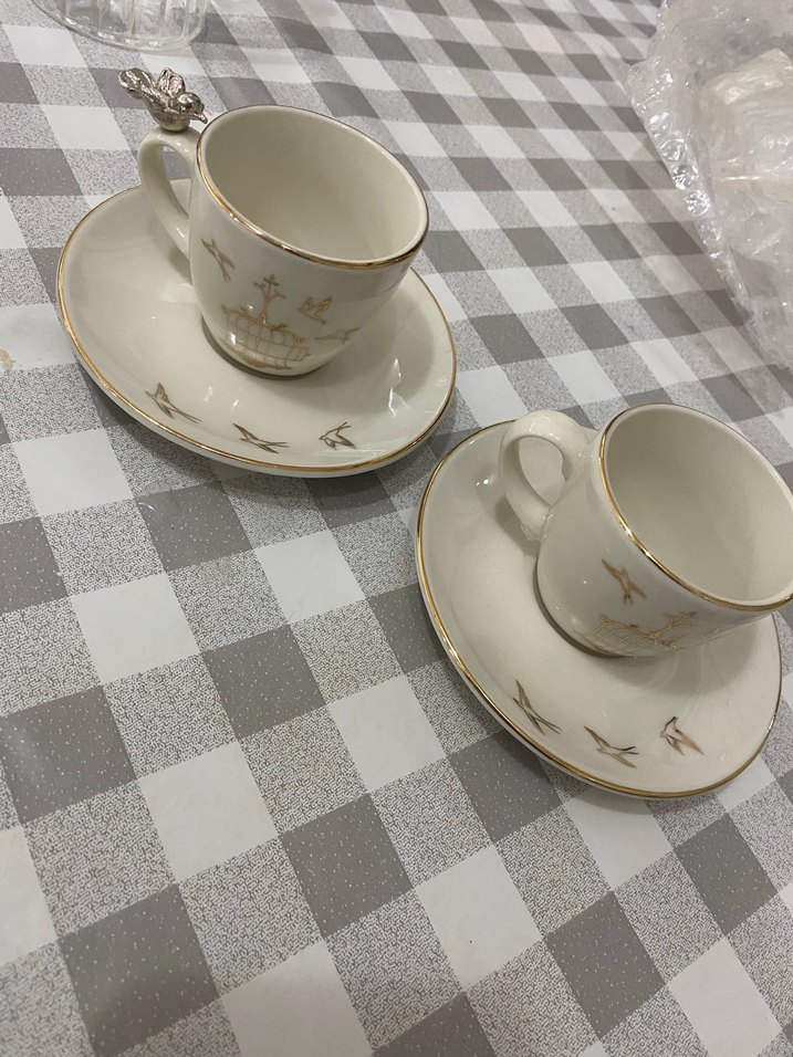 Altın detaylı, gri kuş desenli beyaz porselen fincan ve tabağı seti. ☕ bitanesinin kuşu düşmüş