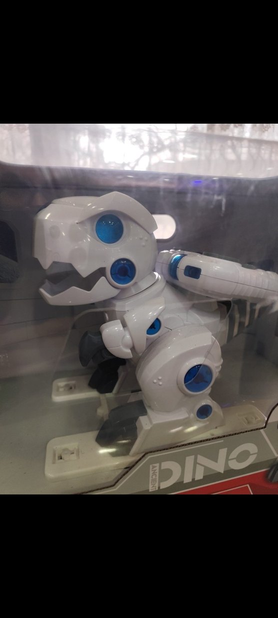 Mavi detaylara sahip beyaz ve gri dinozor aksiyon figürü, hareketli parçalar içerir. Koleksiyon ve oyun için uygundur.
